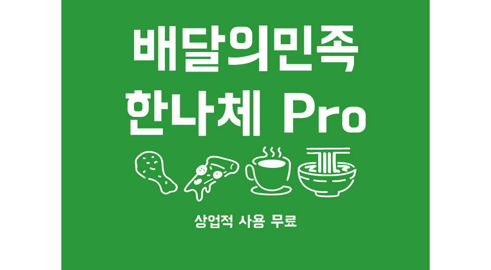 배달의민족에서 무료로 배포하는 글꼴은(한나체·주아체·도현체·연성체·기랑해랑체·한나체 Air·한나체 Pro·을지로체·배민 을지로10년후체) 자유롭게 수정·변경하여 영리적·비영리적 목적으로 개인 및 기업 사용자가 모두 사용하실 수 있습니다.