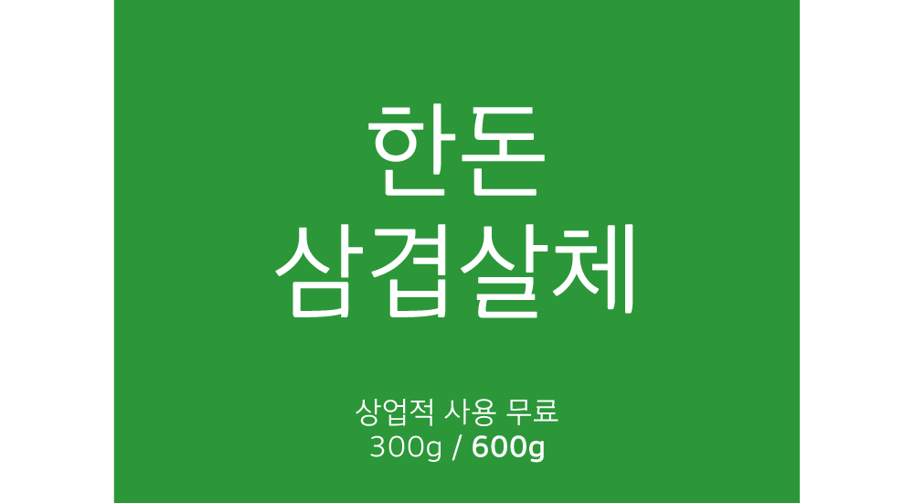 2) 한돈 삼겹살체는 개인 또는 기업이 인쇄물, 광고물, 온라인, 모바일, 영상매체 등에서 자유롭게 사용할 수 있습니다. 단, 회사 로고나 CI 등 개인이나 기업의 대표 이미지를 제작하는데 사용할 수는 없습니다.